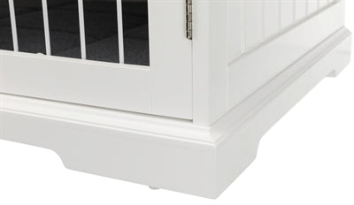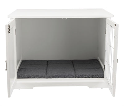 With this crate, your dog will have a cozy, private space in your home that also complements your decor! This beautiful crate is made of white-lacquered MDF and features a barred door. This way, your pet will feel safe and secure while still having a place to keep an eye on the space. The crate comes with a cozy sheepskin-look mat with foam padding for added comfort. The non-slip bottom ensures the mat stays securely in place.