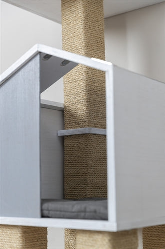 The Trixie Be Nordic Scratching Post Jonte Grey/White 115 cm is a fun scratching post with two places to lie down, a sheltered house, and various scratching options. This scratching post is a real eye-catcher in your home! The post has a beach house feel, thanks to the white den on legs and a small plank. The legs and the post leading to the plank are covered in sisal, allowing your cat to scratch to their heart's content. On the plank, they can snooze or keep an eye on everything going on in the house. For a good night's sleep or a more secluded power nap, they can retreat to the house. Both the plank and the house have a comfortable cushion that is hand-washable. This scratching post is a real must-have for every cat household!