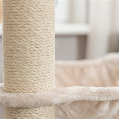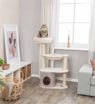 The Trixie Alessia Cat Tree Light Grey/Sand 65X38X114 cm is made of high-quality materials such as jute, plush, and velvet. The padded lying area offers extra comfort and comes with a removable relaxation basket. The hideaway, made of soft velvet, offers your cat a cozy place to rest. The cat tree also features a hammock, perfect for relaxation. Ideal for cats who love to scratch, play, and relax in style.