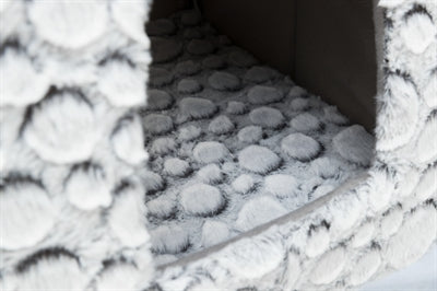The Trixie Cat Basket Igloo Mila Plush White/Grey 32X32X42 cm is an original hiding place for the cat or small dog, a dimensionally stable house covered with soft plush and equipped with a cushion.