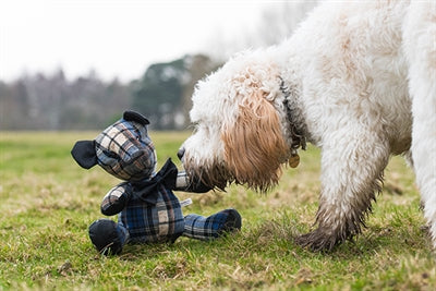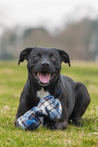 The Rosewood Blueberry Bear in Checkered Blue is a comfortable dog toy perfect for cuddles and playtime. Made of high-quality plush materials, the blueberry bear has a squeaker inside.