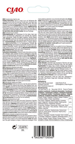 Analytical constituents: Crude protein (min) 7%, crude fat (min) 0.2%, crude fibre (max) 0.6%, moisture (max) 88%, Vitamin E (min) 310IU/kg, taurine (min) 0.025%