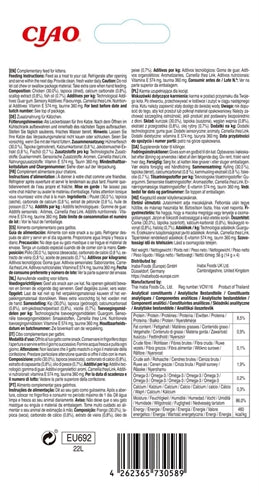 Analytical constituents: Crude protein (min) 7%, crude fat (min) 0.8%, crude fibre (max) 0.3%, moisture (max) 88%, DHA (min) 0.04%, EPA (min) 0.04%, Calcium (min) 0.3%, Vitamin E (min) 310IU/kg, taurine (min) 0.025%