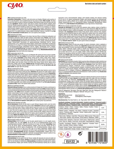 Analytical constituents: Crude protein (min) 7%, crude fat (min) 0.2%, crude fibre (max) 0.3%, moisture (max) 91%, Vitamin E (min) 310 IU/kg, taurine (min) 0.025%