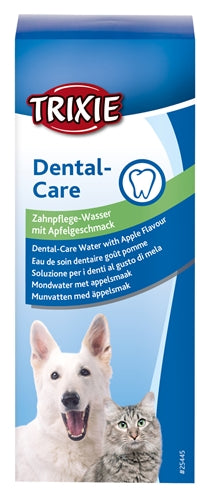 The Trixie Dental Care Mouthwash for Dogs/Cats 300 ml with apple aroma cares for your dog or cat's teeth through their drinking water, for better oral hygiene. The easiest dental care for your dog or cat: simply shake and add the mouthwash to their drinking water at a ratio of 1:50. The mouthwash dissolves in the water and helps prevent harmful bacteria in the mouth. This ensures better oral hygiene for your pet, resulting in fresh breath and healthier teeth.