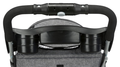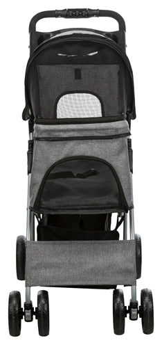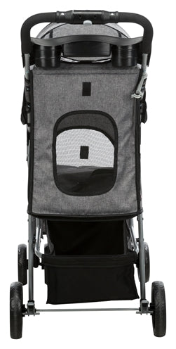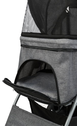 The Trixie Dog Buggy Gray 47X80X100 cm is a foldable four-wheeled dog buggy with one-hand operation and parking brakes. This buggy ensures that even old, sick, anxious or very young dogs and cats can come along for the ride. The buggy is comfortable and safe thanks to the four wheels, which provide more stability, and the two parking brakes. It can be operated with one hand using the push bar: this also allows you to take another dog on a leash. The push bar, bottle holder and basket are also padded for more comfort. A large tailgate makes getting in and out easier and the short leashes (two in total) prevent the animal from accidentally jumping out of the buggy. You can use the buggy partially or fully closed thanks to the zippers, thus adapting it to any weather type and every passenger. Even when closed, there is sufficient ventilation and visibility through the mesh inserts. This buggy comes with a removable cushion with removable upholstery.