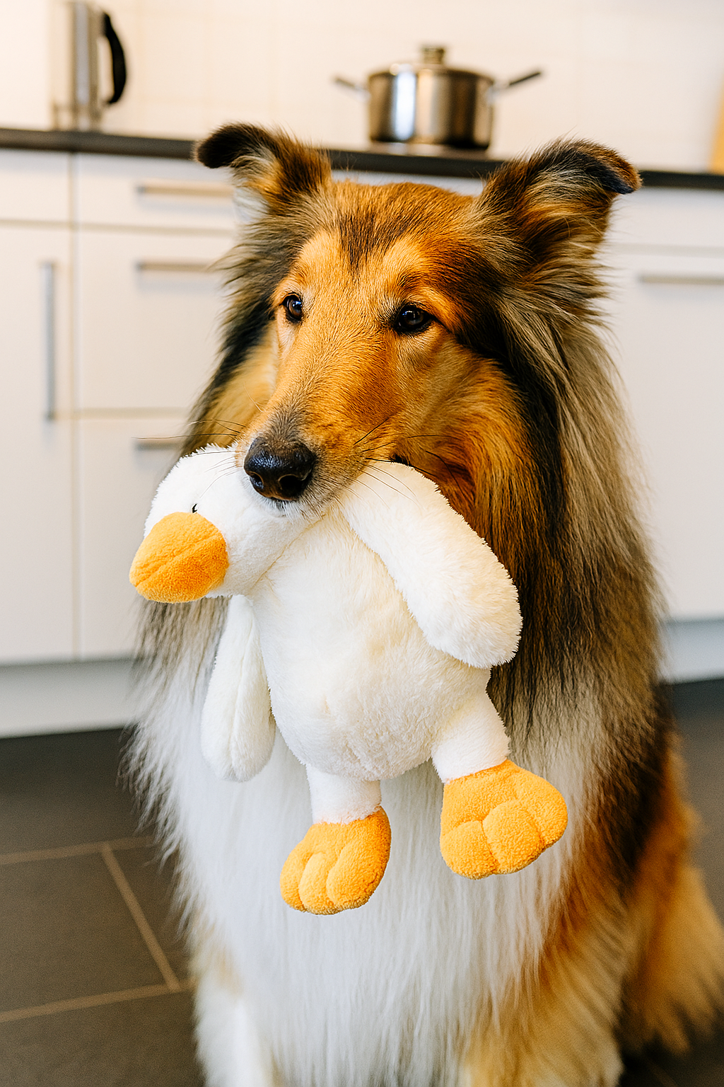 This cute Trixie cuddly toy is a unique toy for dogs. It's shaped like a duck with a long neck, making it easy to play with. It's made of plush, making it wonderfully soft. The duck makes sounds for added fun and is 38 centimeters tall.